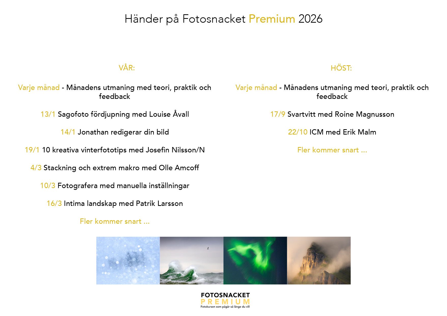 Fotosnacket Premium är både en fotokurs och en samlingsplats för dig som brinner för fotografi. Här får du tillgång till exklusiva live-sessioner, fotoutmaningar, teori, personliga mentorskap med feedback och mycket mer.